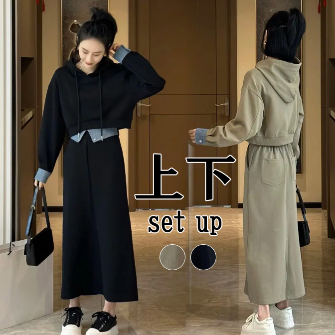 二〇二五年新作のスウェットセットアップ。 上品なパーカーとスカートの組み合わせで、着やせ効果抜群。 きれいめスタイルにも着回しやすく、長袖で季節を問わず活躍します。