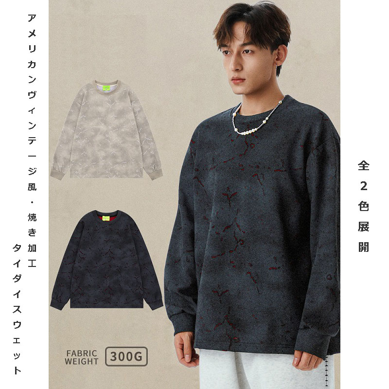 古着感あふれる焼き加工が施されたメンズスウェットです。