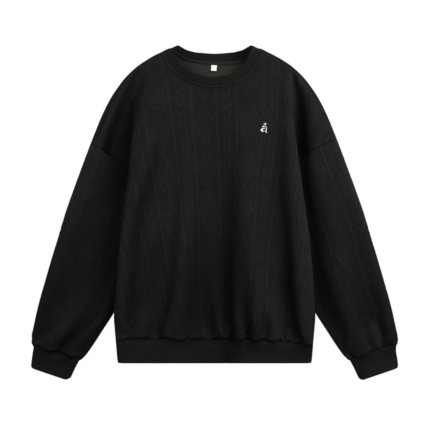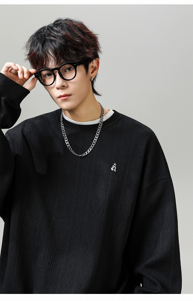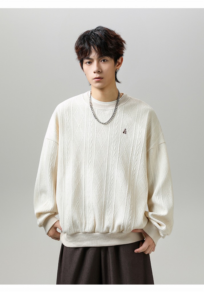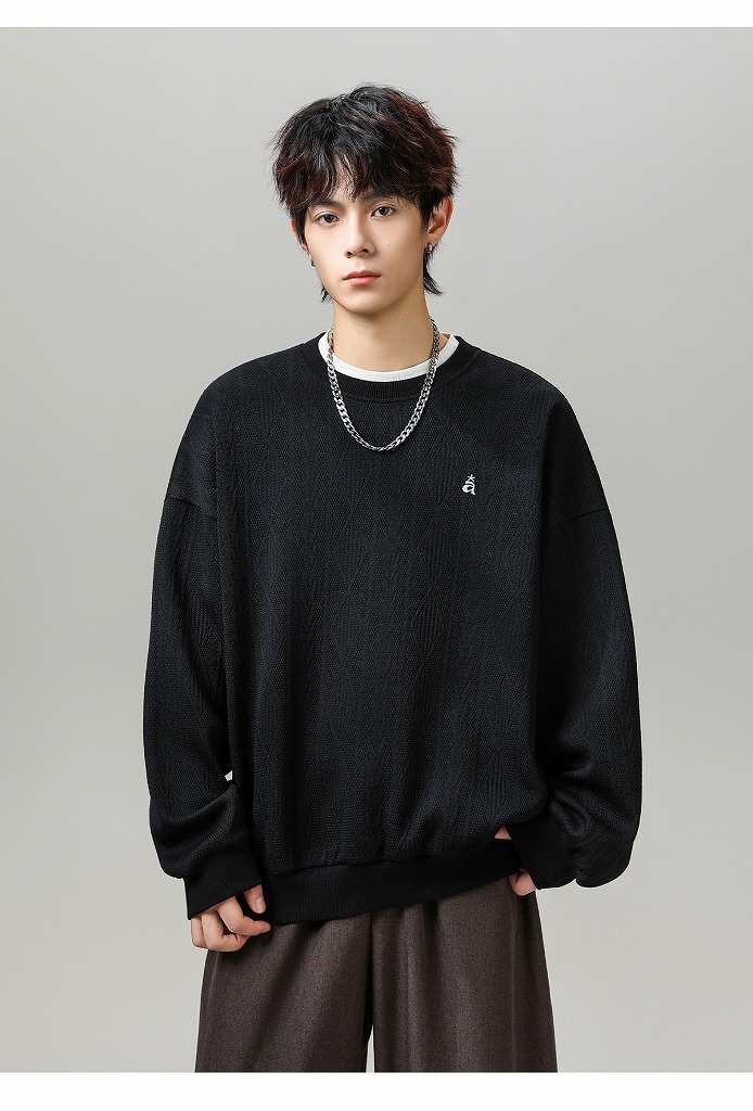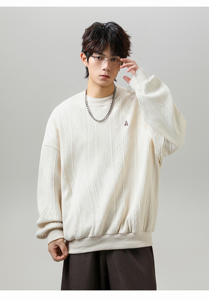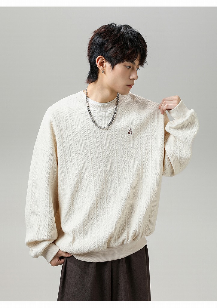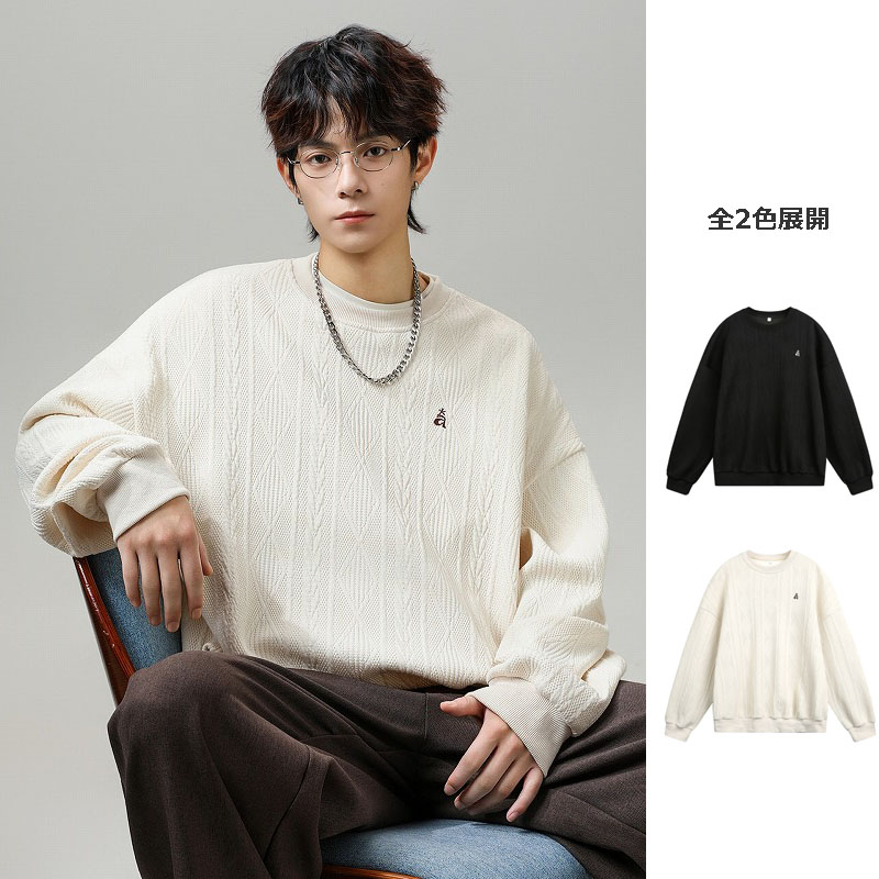 ジャカード風の編み込みデザインがおしゃれなクルーネック仕様。