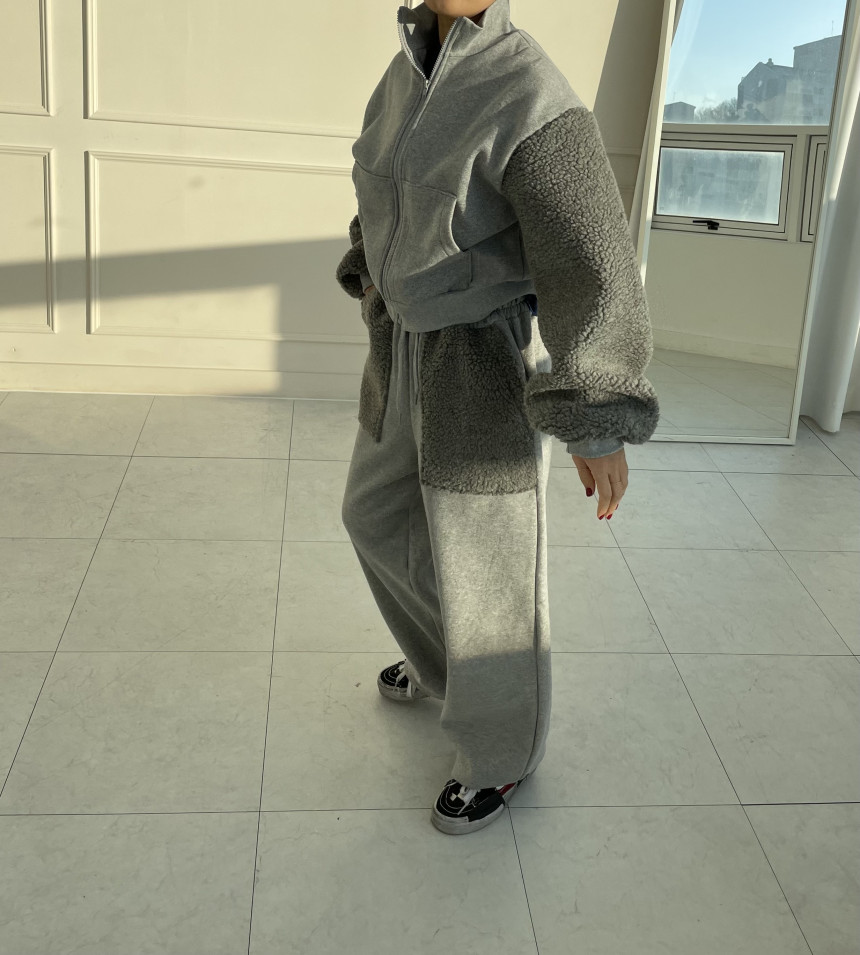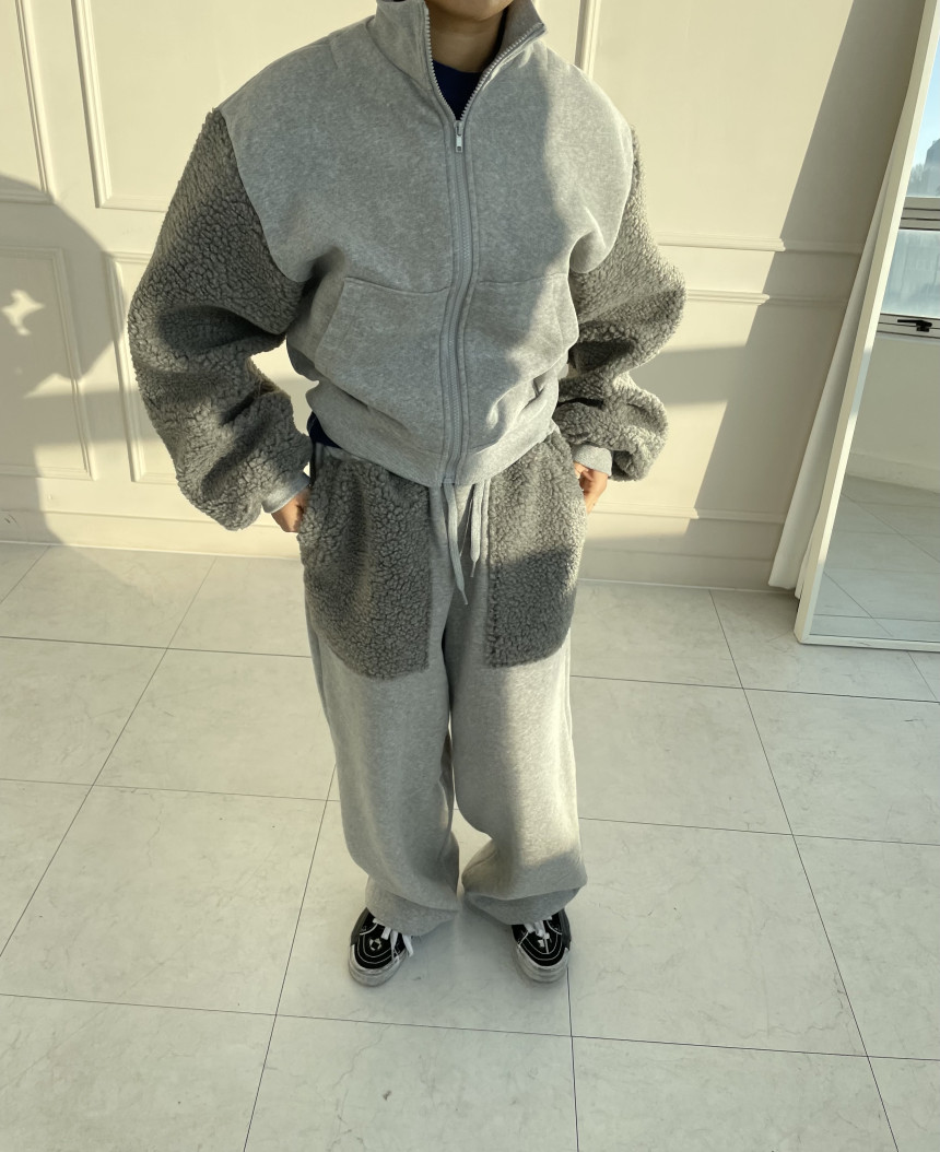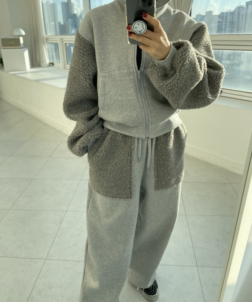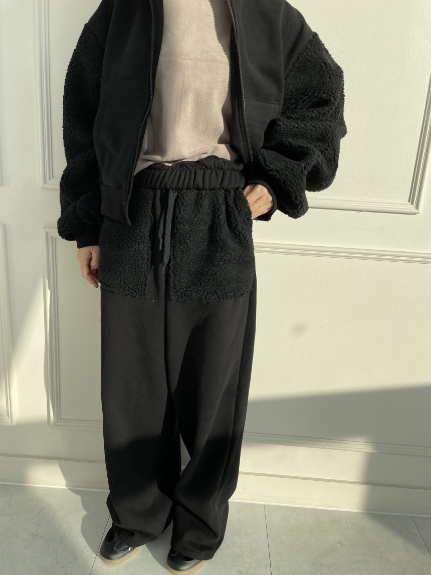 今季注目のもこもこボア素材を贅沢に使用したスウェットセットアップ。 ジップアップトップスとワイドパンツの上下セットで、一枚でこなれ感のある着こなしが完成。 ふわふわの肌触りと程よいゆとりで、リラックスタイムから外出まで幅広く活躍します。
