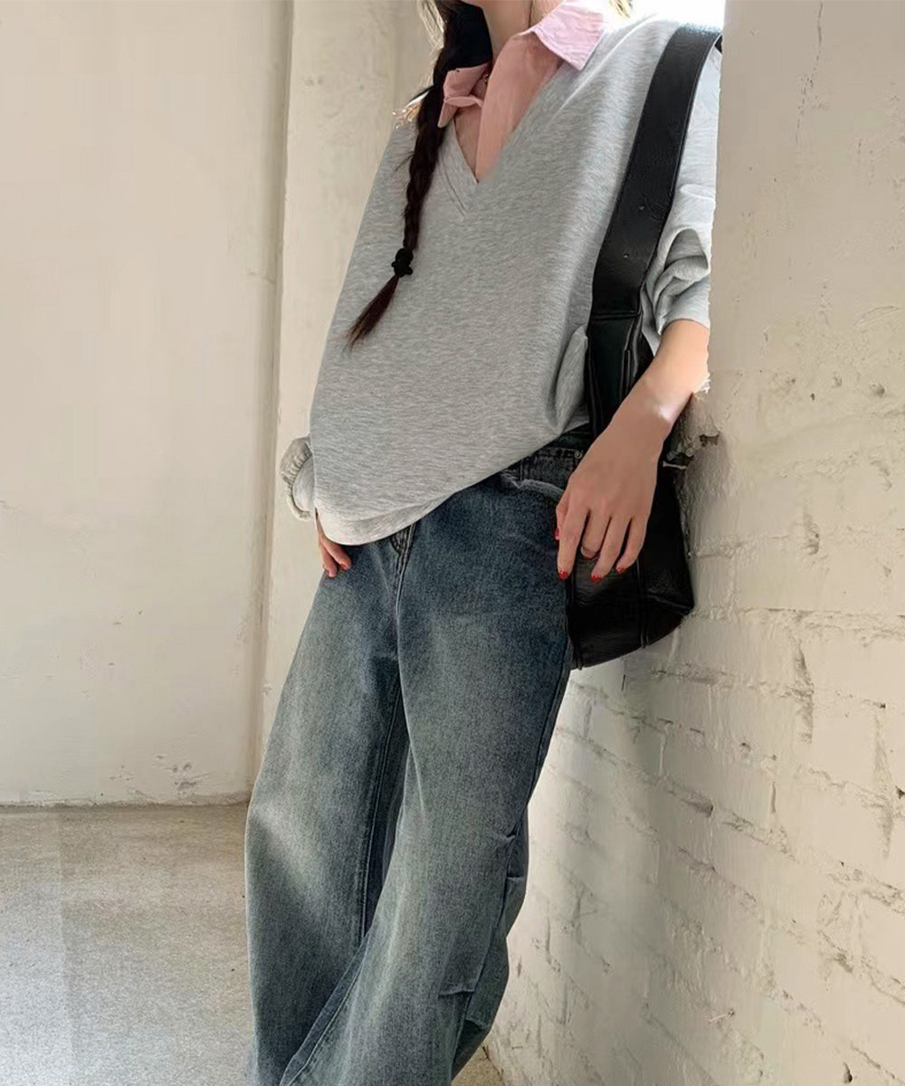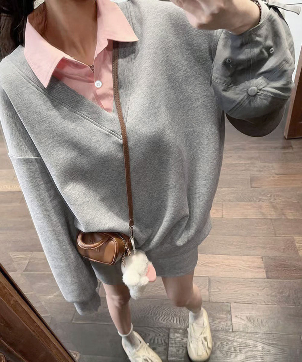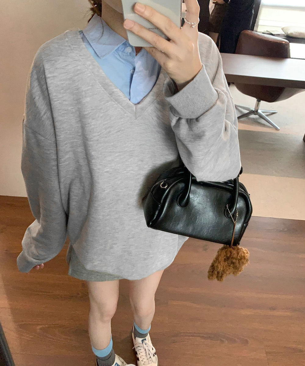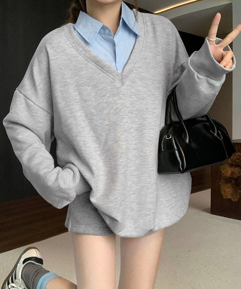 顔まわりをすっきり見せるブイネックと、きちんと感のあるシャツカラーでカジュアルすぎない印象に。