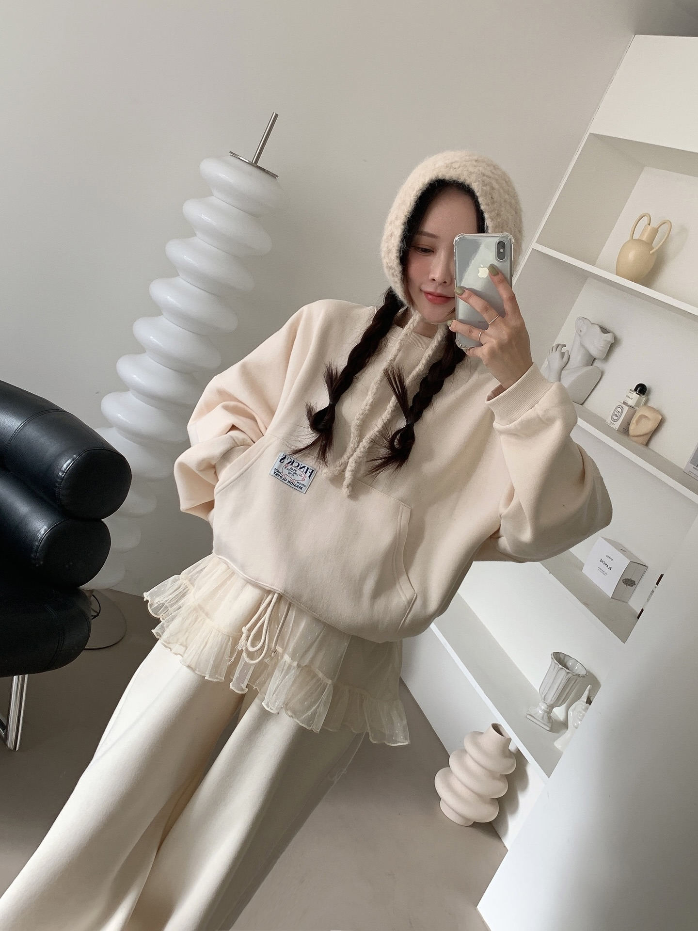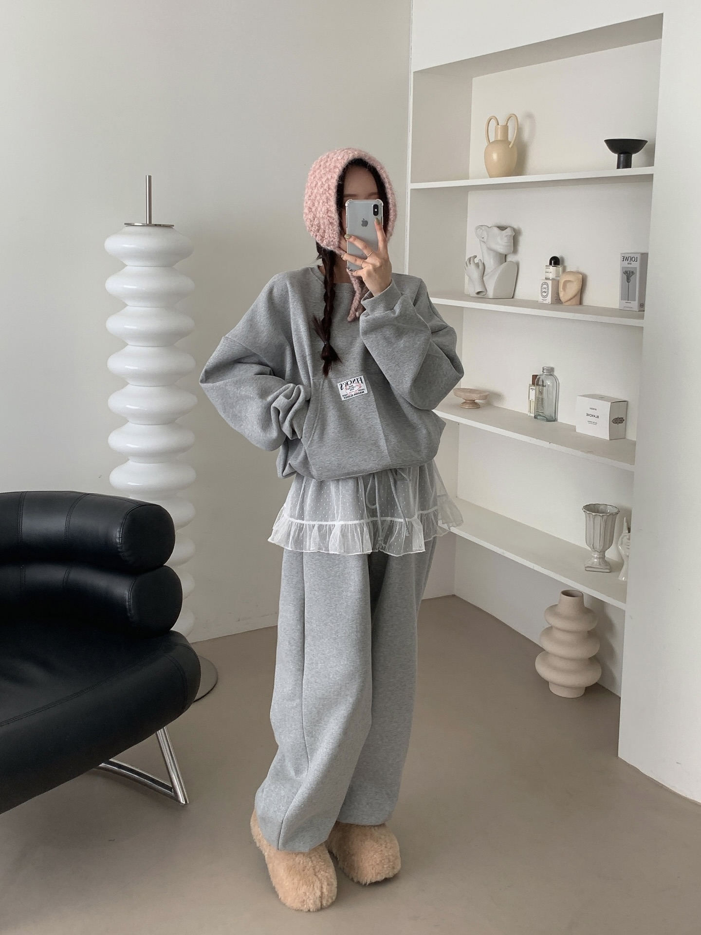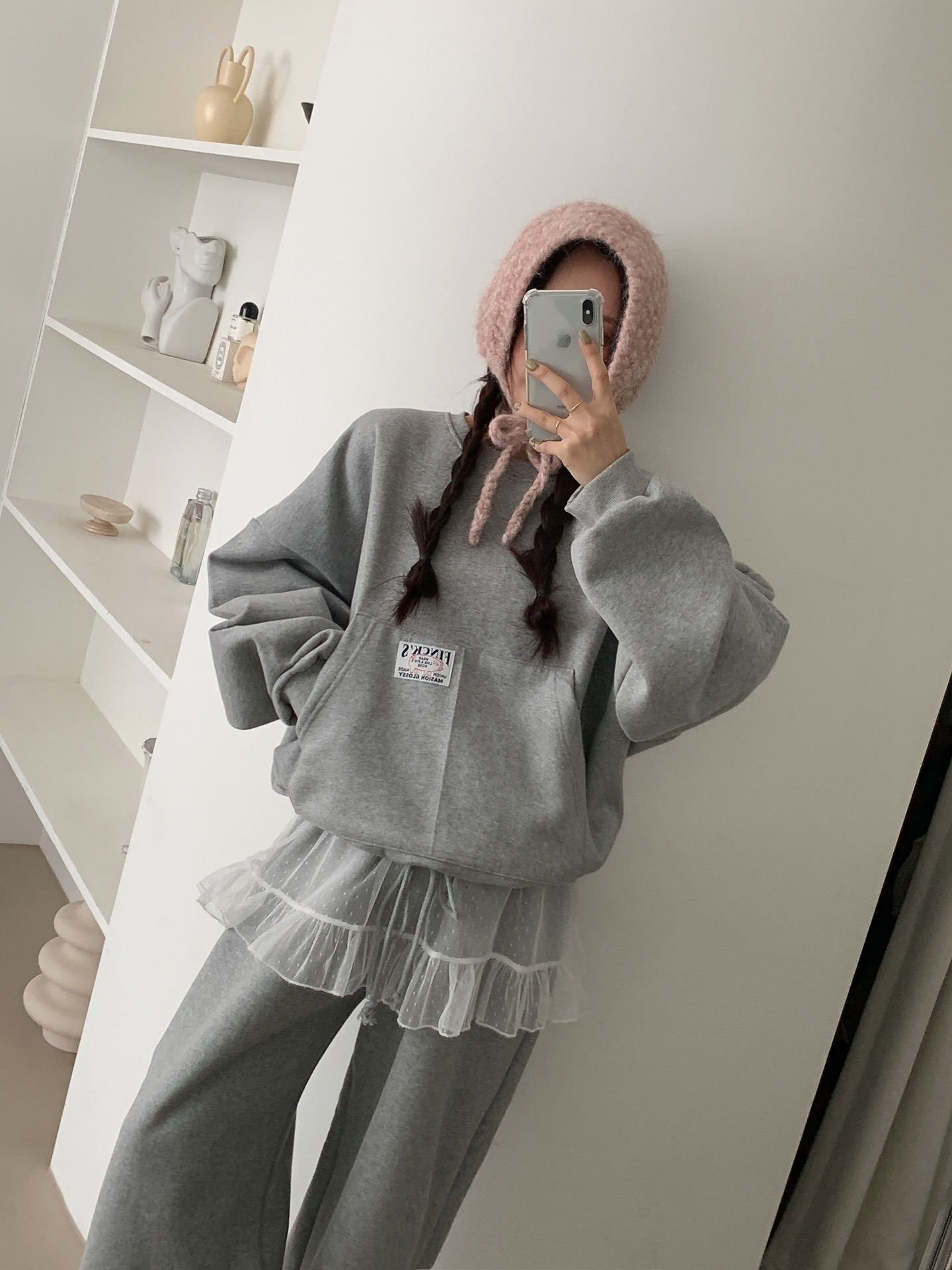 今季注目の韓国風デザインが魅力的なスウェットセットアップです。 柔らかな丸首スウェットと透け感のあるメッシュミニスカートの組み合わせで、 カジュアルながらも上品な印象を演出します。デイリーコーデにぴったりの一着です。