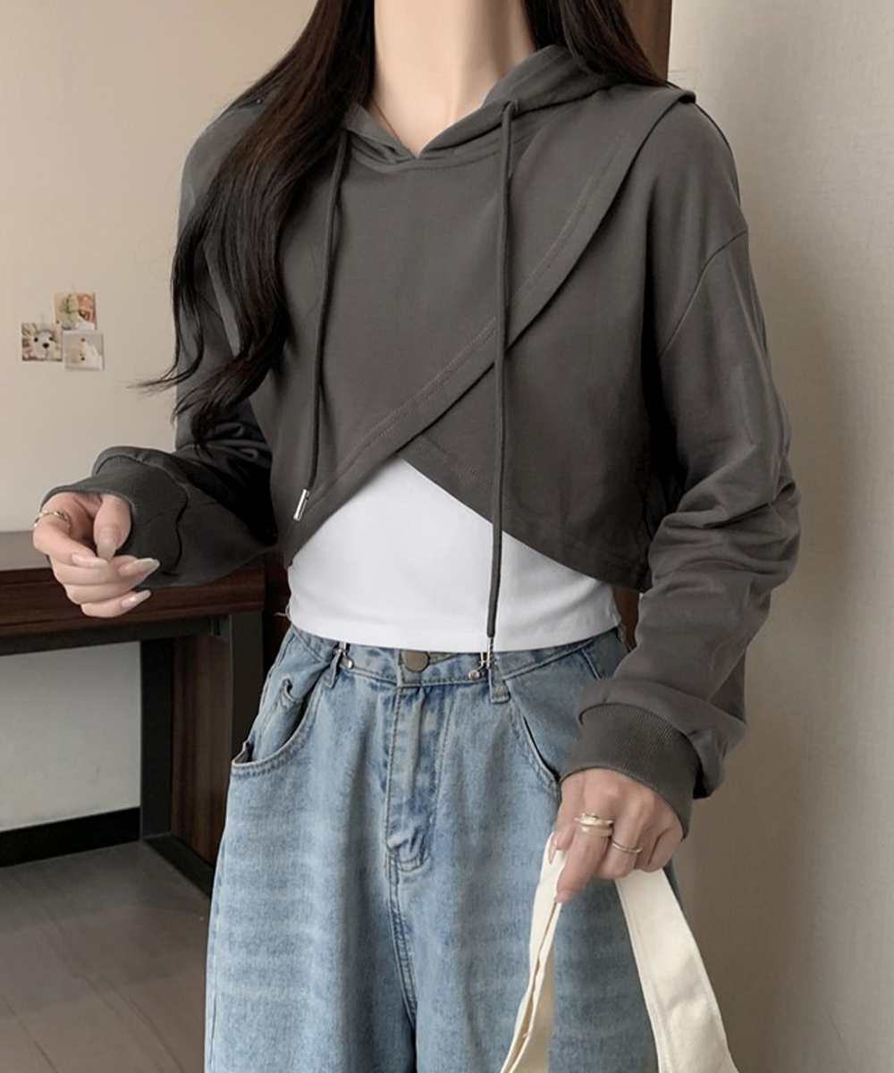 へそ出し アシンメトリーフーディ ショート丈パーカー 薄手キャミソール2点セット レイヤードトップス韓国風 着やせ春秋服 フード付きトップス ダンス衣装トップス 春アンサンブル長袖 ショート丈フーディとインナーを組み合わせた、レイヤード2点セットトップス。 アシンメトリーなデザインと短丈バランスで、すっきりとした印象に。 ゆとりのあるシルエットと薄手素材で、軽やかな着心地が魅力。 セット着用はもちろん、フーディとインナーを単体でも使いやすい。 動きやすさを意識した仕様で、ストリートコーデやダンスシーンにも対応。 ワイドパンツやスウェットと合わせた、ラフなスタイリングがおすすめ。 トップス素材:ポリエステル80%+綿20% キャミソール素材:ポリエステル98%+ポリウレタン2% カラー:チャコールグレー/ホワイト サイズ:ワンサイズ トップス: 着丈:前丈約38cm/後ろ丈約42cm 肩幅:約52cm 袖丈:約55cm ゆき:約81cm 身幅:約51cm 胸囲:約102cm キャミソール: 総丈:約37cm 身幅:約37cm 胸囲:約74-105cm 裏地:なし 伸縮性:キャミソールのみあり 透け感:ホワイトキャミのみややあり