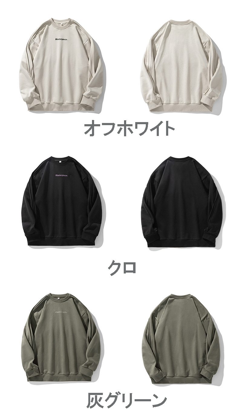 サイズ表記単位:CM 採寸に個人差があり1-2cm誤差がある場合がございます。 ▲【カラー】クロ、灰グリーン、オフホワイト ▲【素材】コットン、ポリエステル ▲【セット内容】トレーナー ▲【サイズ】 M 着丈68cm バスト120cm 肩幅59cm 袖丈54cm L 着丈70cm バスト124cm 肩幅61cm 袖丈55cm XL 着丈72cm バスト128cm 肩幅63cm 袖丈56cm XXL 着丈74cm バスト132cm 肩幅65cm 袖丈57cm